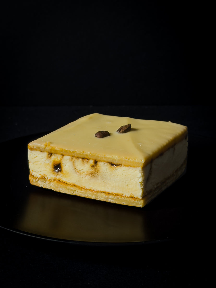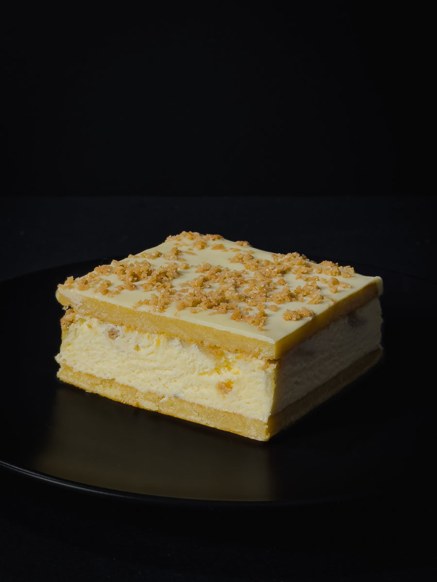 Blondie (caster sugar, brown sugar, water, gluten-free flour [rice, corn], butter (milk), white chocolate [milk,soy lecithin], wholeegg, baking soda), Ice cream (cream (milk), caster sugar, lemon reduction [lemon juice, sugar], vodka, thickener [locust bean gum, gellan gum], wholeeggyolk, vanilla extract), Italian meringue ripple (caster sugar, water, egg white [egg]), Chocolate coating (white chocolate [milk,soy lecithin], vegetable oil, sunflower lecithin, salt).